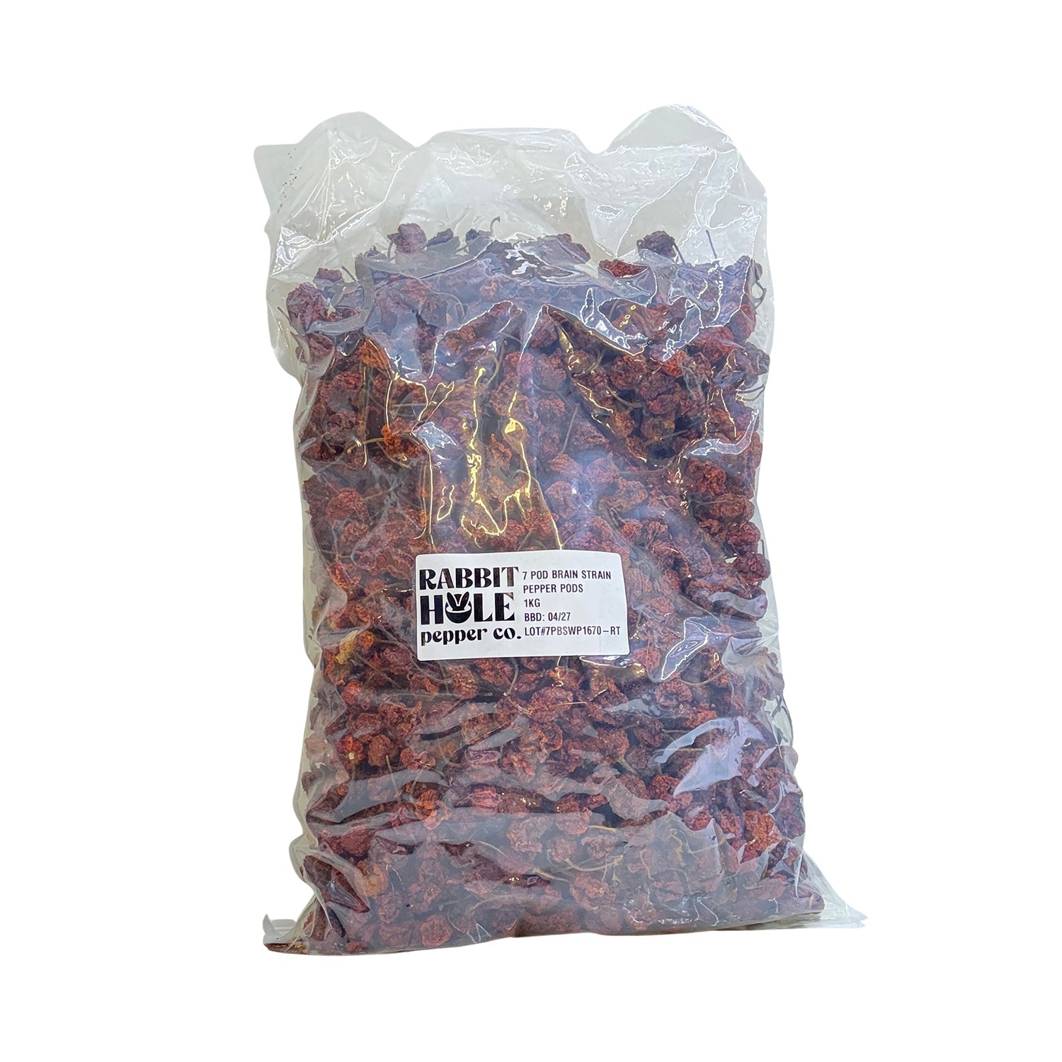 Our bulk 7-Pot Brain Strain Dried Pepper Pods are available in 1 lb and 1 kg bags.